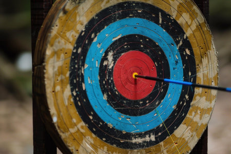 Blue arrow hitting the center of an archery target on a sunny day