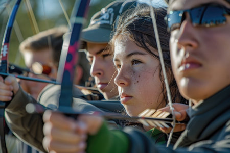 A group of individuals equipped with bows and arrows are concentrated and ready, aiming with precision and focus in a standard scale setting.