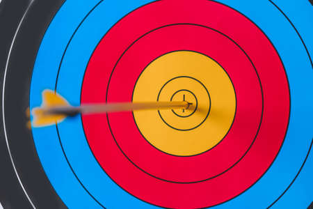 Arrow hitting the center of an archery target on a wooden background