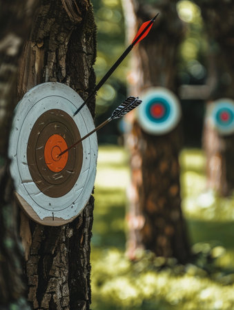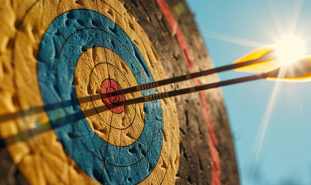 Vibrant concentric rings of a target as a sleek arrow flawlessly strikes the center, symbolizing precision, focus, and achievement.