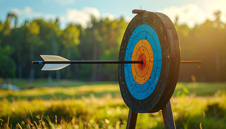An arrow striking the center of a colorful archery target in a serene outdoor environment during daylight