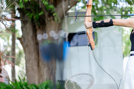 Archery competitions. A young woman holds a bow and arrow and is about to shoot. The concept of focus and determination when a woman prepares to shoot an arrow.