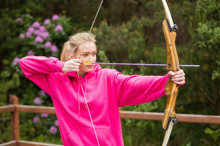 Concentrating blonde practicing archery at the range