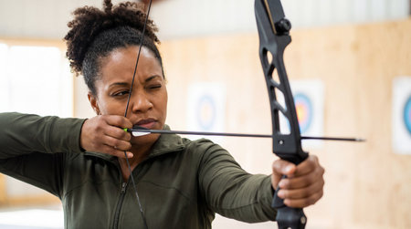 Focused Female Archer with Determined Expression, Drawing Back Recurve Bow in Indoor Range