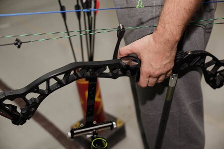 Archery. Man with a bow - close up view of a hands. Cropped image.