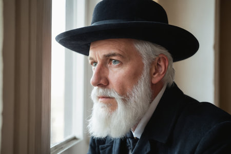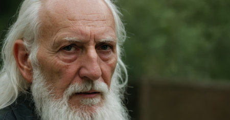 Close-up portrait of a contemplative senior man with a long white beard and hair, conveying a sense of wisdom and experience