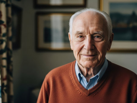 portrait of a happy senior man at home, created with generative ai