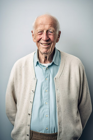 Portrait of a happy senior man smiling in front of a grey background