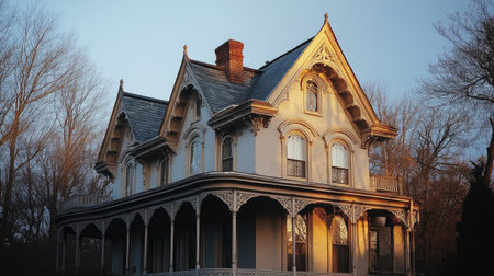 A stunning Victorian house showcasing detailed architecture, surrounded by trees and bathed in warm sunset light, creating a captivating scene.
