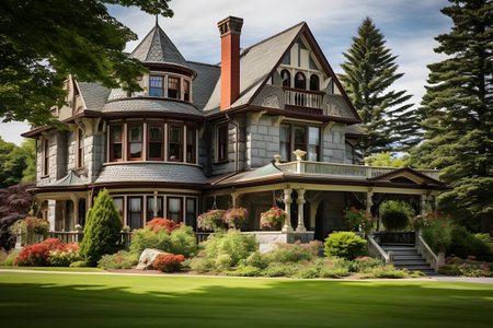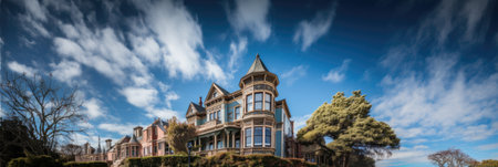 Panorama of a classic Victorian house in the middle of the park