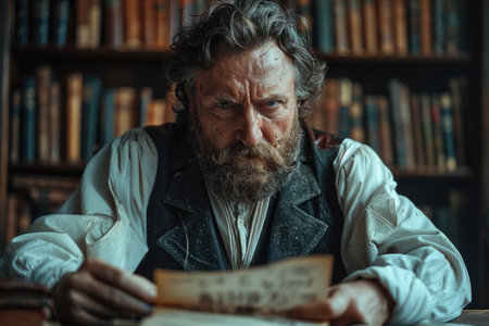 Senior man with gray beard and glasses, seated in a warm, inviting room surrounded by books, reflecting on life experiences in a peaceful atmosphere