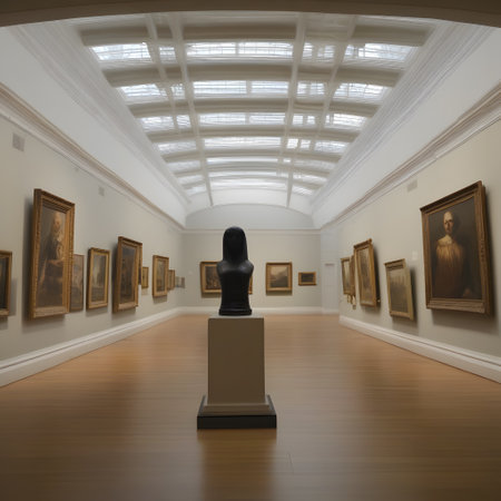 Art enthusiasts wander through a spacious gallery, admiring vintage artworks displayed against soft blue walls. The grand architecture enhances the atmosphere of culture and creativity.