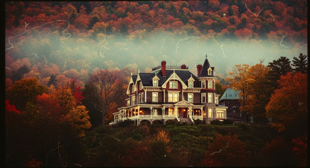 A grand Victorian mansion showcases its intricate architecture amidst a peaceful autumn landscape with colorful foliage and a well-kept garden.