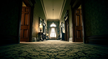 This image showcases the interior of a grand and opulent mansion,featuring a stunning hallway with intricate architectural details,including a magnificent staircase,ornate wood paneling,and a