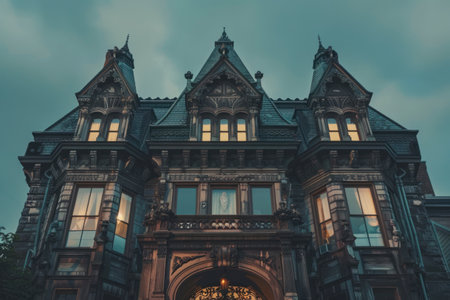Victorian Gothic mansion facade with ornate details and looming turrets.