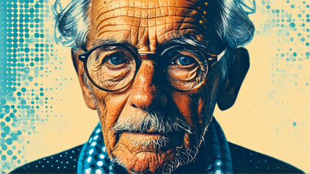Thoughtful portrait of elderly man in glasses with textured background.