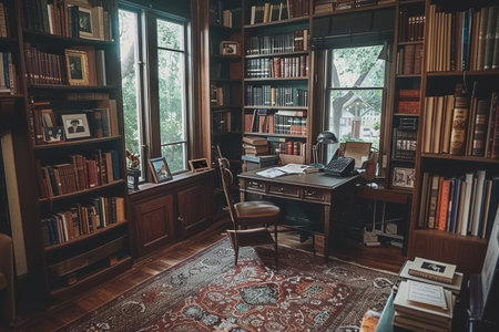 A room filled with books and various pieces of furniture, including bookshelves and a desk chair, A cozy study nook with a desk, chair, and bookshelves filled with textbooks and educational resources