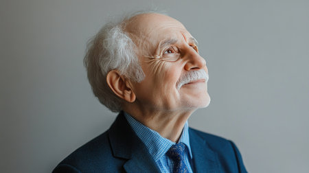 A charming elderly man with gray hair smiles gently while looking upwards in a professional suit, embodying warmth and wisdom in a serene portrait.