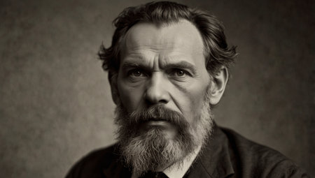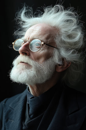 An elderly man with wild gray hair and round glasses looks thoughtfully into the distance. He is dressed in a formal black suit. The dark background highlights his expressive features. Soft lighting enhances the contemplative atmosphere.