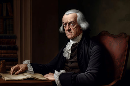 American traditional male portrait with white wig. Man in black robe sitting at the table. Generate ai
