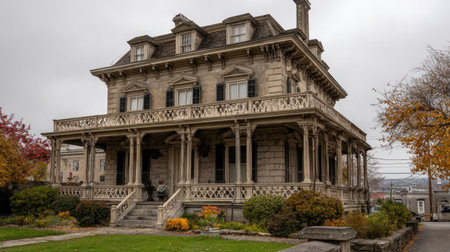 This image captures a beautifully preserved Victorian house with intricate architecture, surrounded by vibrant autumn foliage and a lush green lawn.