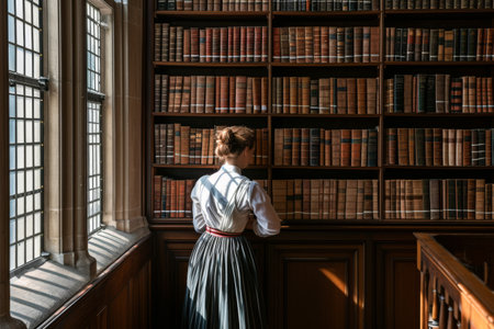 Back view of young woman standing in front of bookshelf in library