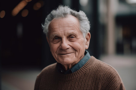 Portrait of smiling senior man with grey hair in brown sweater looking at camera