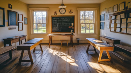 A serene, historic classroom showcasing traditional wooden desks and a chalkboard, filled with natural light, evoking a sense of nostalgia and educational ambiance.