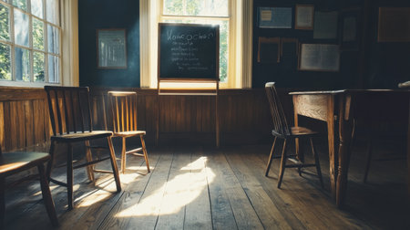 A captivating and serene vintage classroom interior showcasing wooden chairs, a chalkboard, and warm sunlight illuminating the rustic wooden floor, ideal for educational themes.