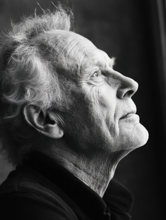 An elderly man with wispy white hair looks contemplatively upwards, bathed in soft light coming from a nearby window. The calm expression suggests deep reflection and wisdom.