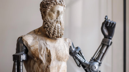 A fictional damaged statue of a man with his arms crossed and wearing a robe, AI