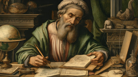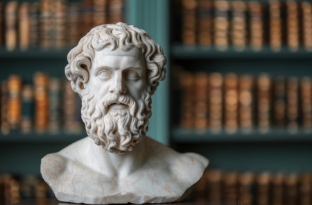 Ancient Greek philosopher in contemplative pose toga adorned with mathematical symbols