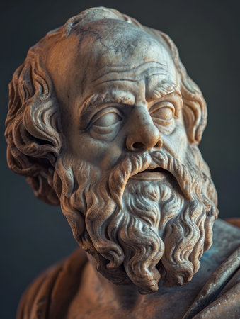 Socrates appears deep in thought, showcasing his iconic beard and contemplative demeanor. The stark white background emphasizes his philosophical nature and timeless wisdom.