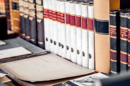 Paper documents stacked in archive. folders with documents on the shelves of archive room. Office shelves in the closet full of files. folders with files documents in archive