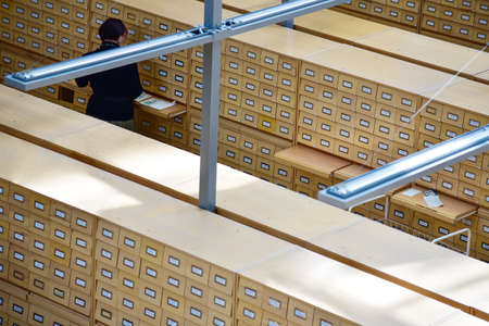 Search for information in the database. A man holds a paper card with information. Wooden cupboard in an office or library. Secret documents