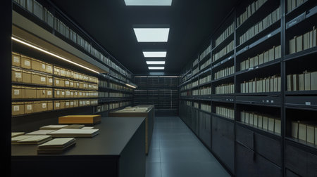 Colorful folders are neatly arranged on metal shelves in a spacious archive. The bright daylight filters through the building, illuminating the organized filing area.