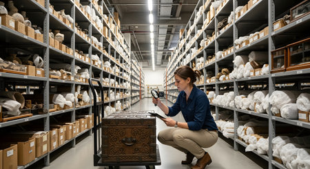 A female curator kneels in a vast museum storage facility, carefully examining an antique wooden chest with a magnifying glass. She is surrounded by shelves packed with historical artifacts, representing history, research, and cultural heritage preservation.