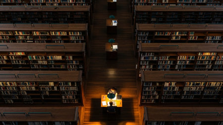 Drone aerial view (90-degree orthophoto) emphasizing the linear geometry of a historic library's int
