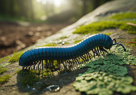 Vibrant blue millipede with numerous legs crawling slowly across a textured, moss covered rock in a sunlit, humid forest environment. detailed macro wildlife shot.