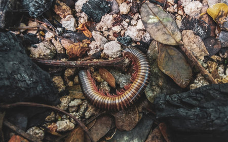 Centipede on the ground in the forest, close-up