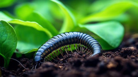 Millipede on soil amid green leaves, close-up view. Nature and wildlife concept