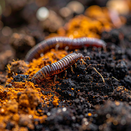 A detailed macro photograph captures a millipede navigating its way through nutrient-rich soil.