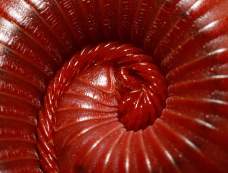 Macro of orange and brown millipede on glass with reflection, Millipede coiled, Disambiguation, Low key photo.