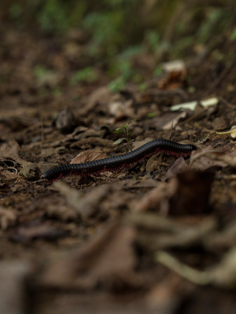 Millipede crawling on forest floor in autumn, macro shot. Nature and wildlife concept