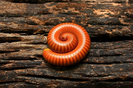 The millipede rolled into a circle on old wood sheet