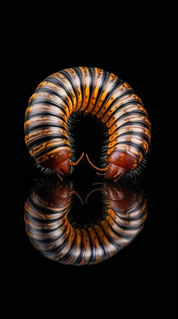 A mesmerizing macro photograph showing the intricate details of a millipede against a dark backdrop.