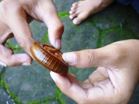 Julida is an order of millipedes on the man's hand.