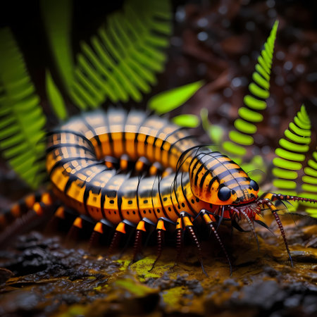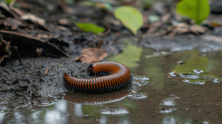 A striking close-up image of a colorful centipede moving along wet ground near small green plants, capturing the serene beauty of nature in exquisite detail.