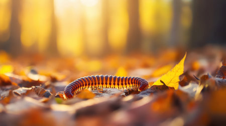 A beautiful millipede crawls across colorful autumn leaves, captured in soft focus against a glowing forest background, showcasing nature's vibrant details.
