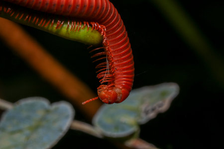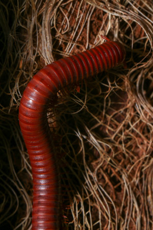 Red centipede in soil on dark background, close-up